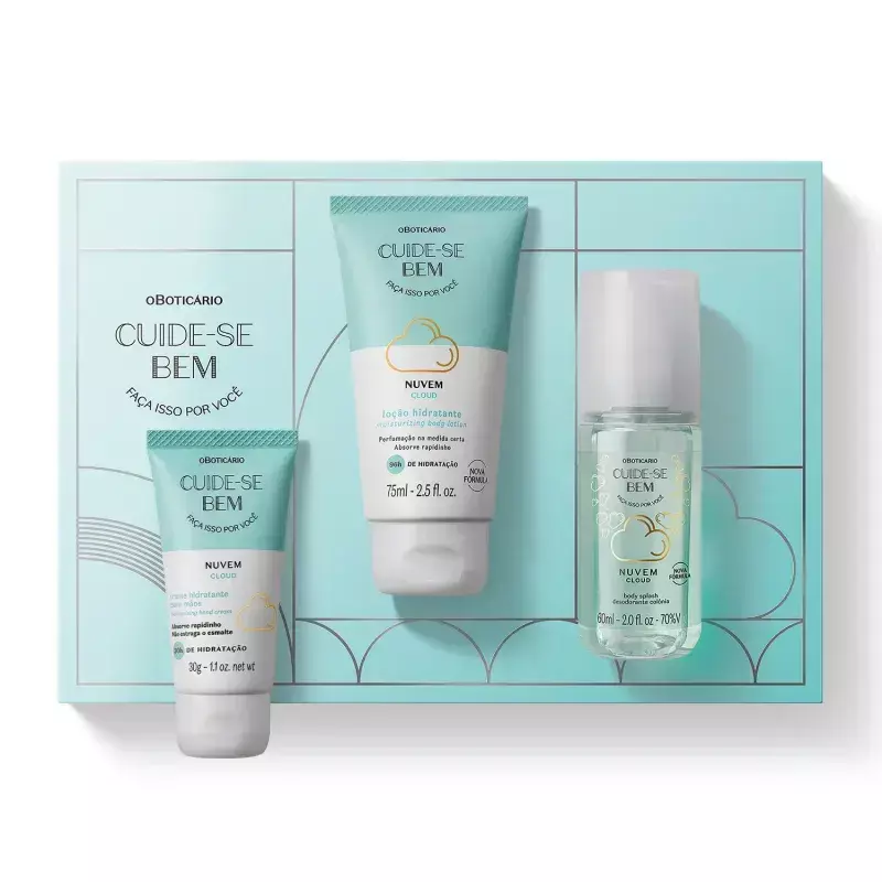 O Kit Presente Cuide-se Bem Nuvem traz 3 produtos da linha para garantir aquela perfumação super agradável e cuidar da pele. Os produtos em miniatura cabem na bolsa, mochila e nécessaire, sendo ideais para manter o momento de carinho e autocuidado. E tem mais: ainda conta com uma caixa de presente que deixa tudo ainda mais especial Confira só o que vem: